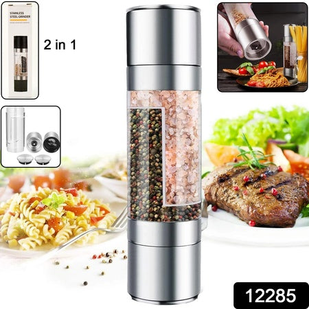 Add convenience and elegance to your kitchen and dining experience with this premium 2-in-1 Salt & Pepper Grinder. Designed with dual compartments, this compact and modern manual grinder allows you to grind two different seasonings—such as rock salt and black peppercorns—in a single device. The stainless steel and acrylic construction gives it a durable, sleek look, perfect for any countertop or dining table.